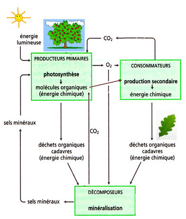 • photosynthèse : c'est un ensemble de phénomènes conduisant à la production de matière vivante et d'oxygène (O2), par les végétaux, à partir de l'eau (H2O) et du gaz carbonique (CO2), grâce à la chorophylle et à l'énergie solaire, on l'appelle aussi production primaire.